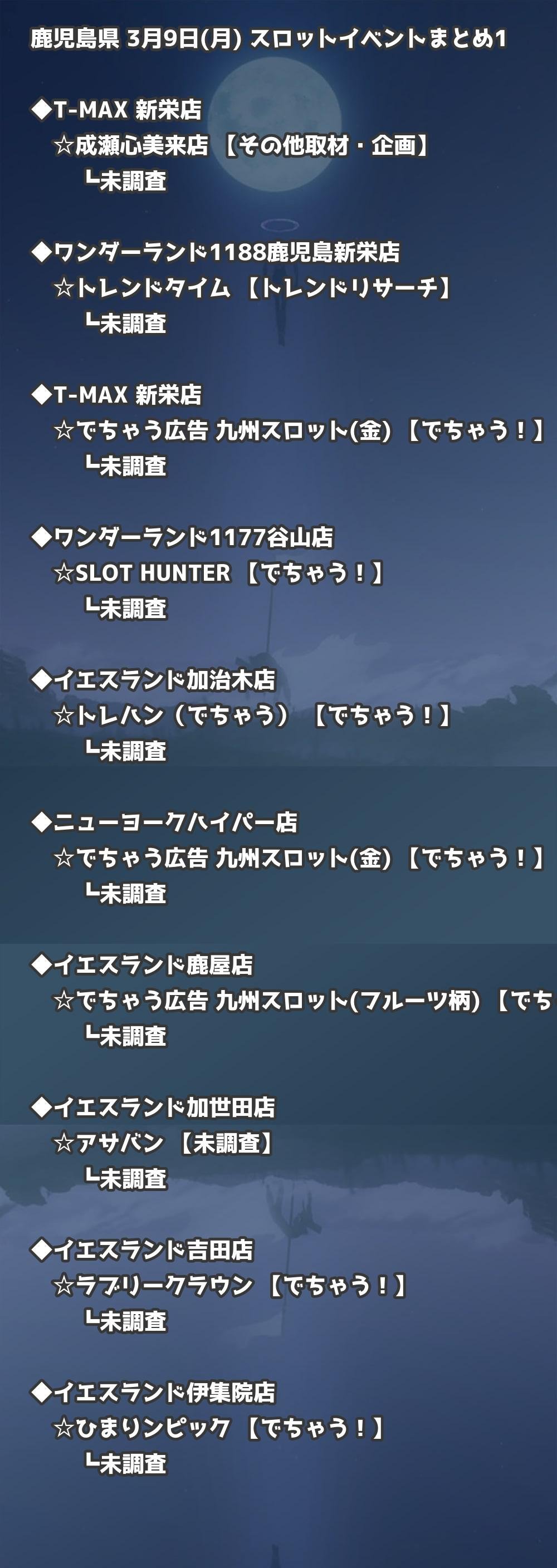 📊 鹿児島県 3月9日(月) 勝てるパチンコ・スロット取材店舗一覧|おすすめ順