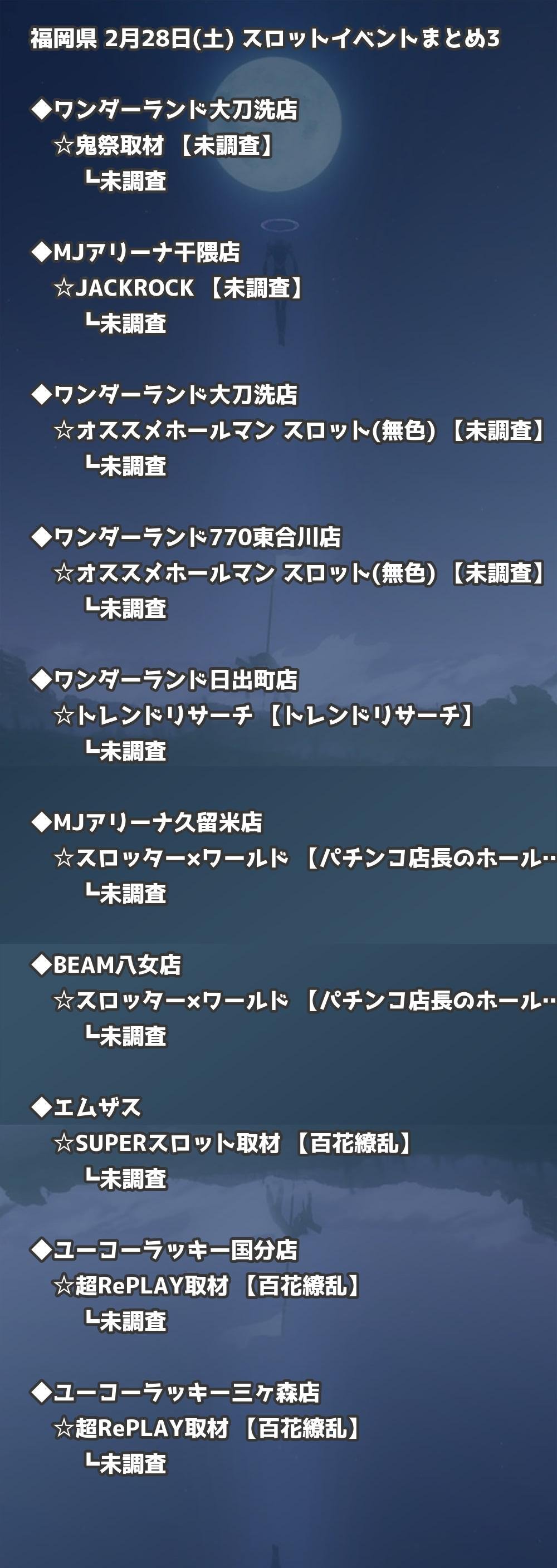 | ワンダーランド大刀洗店 | オススメホールマン スロット(無色) | 未調査 |