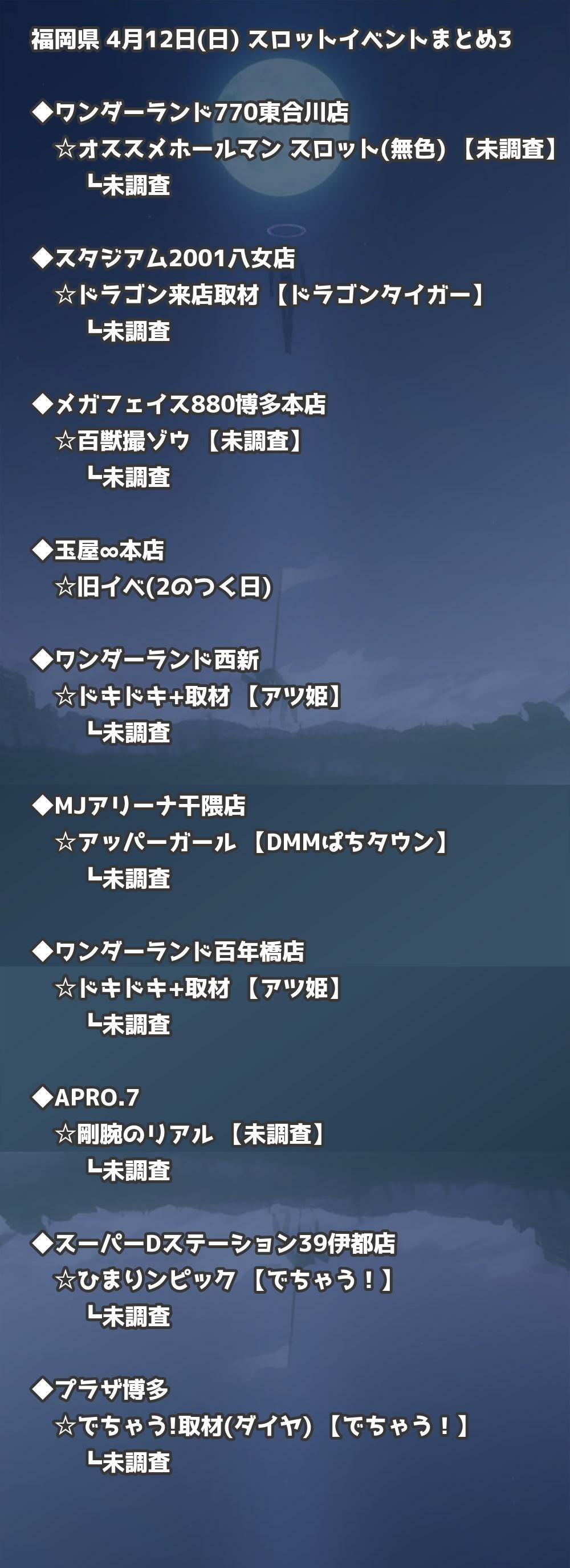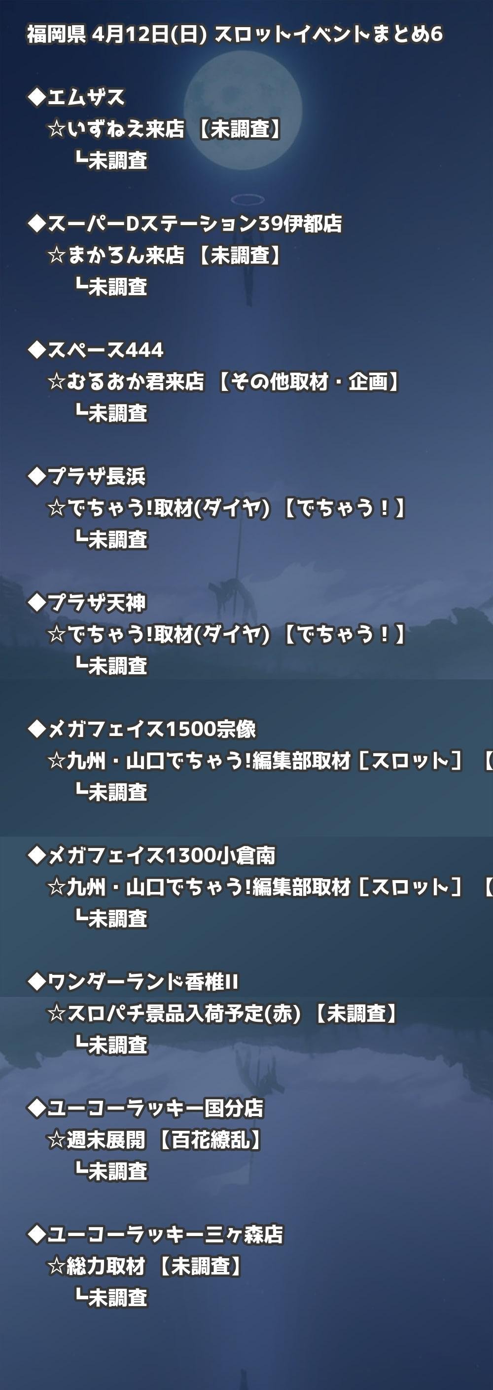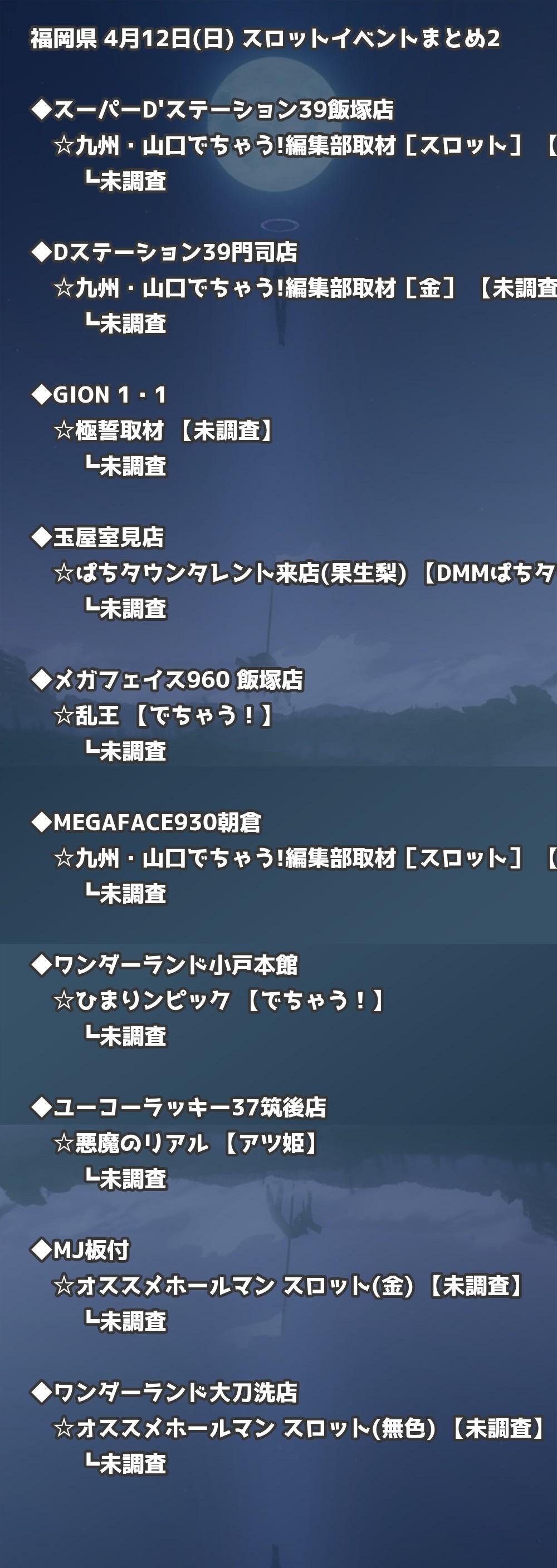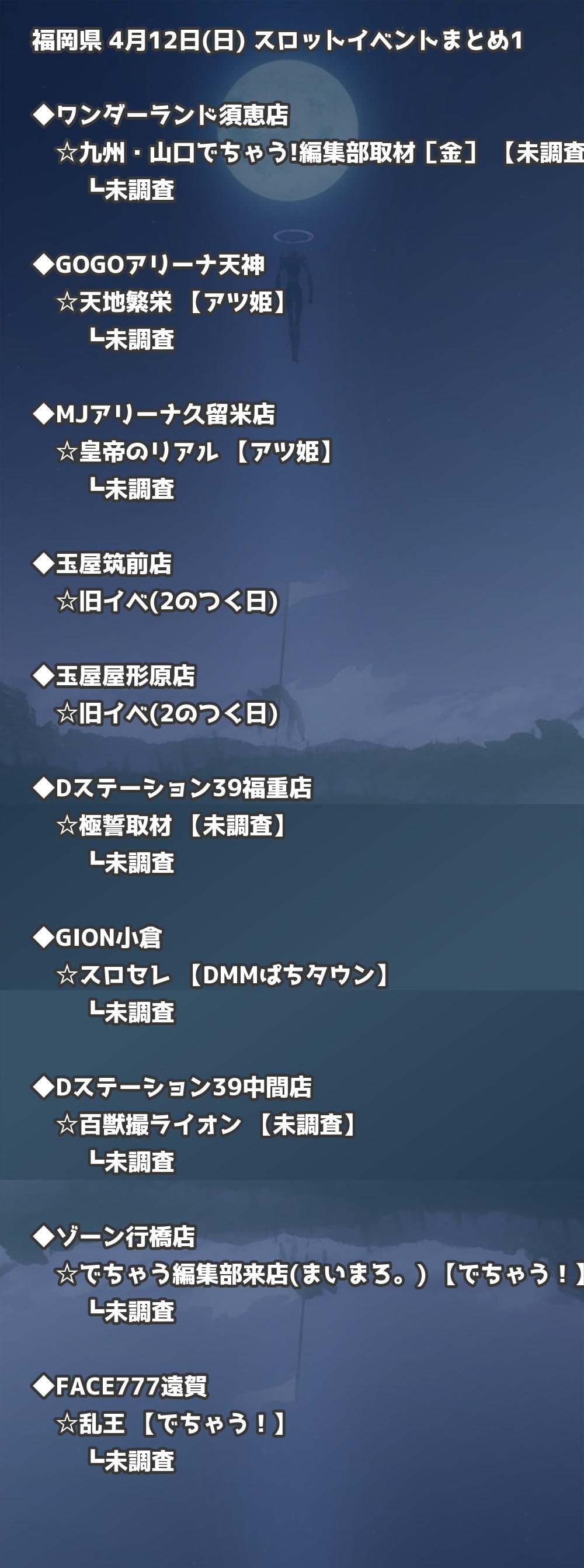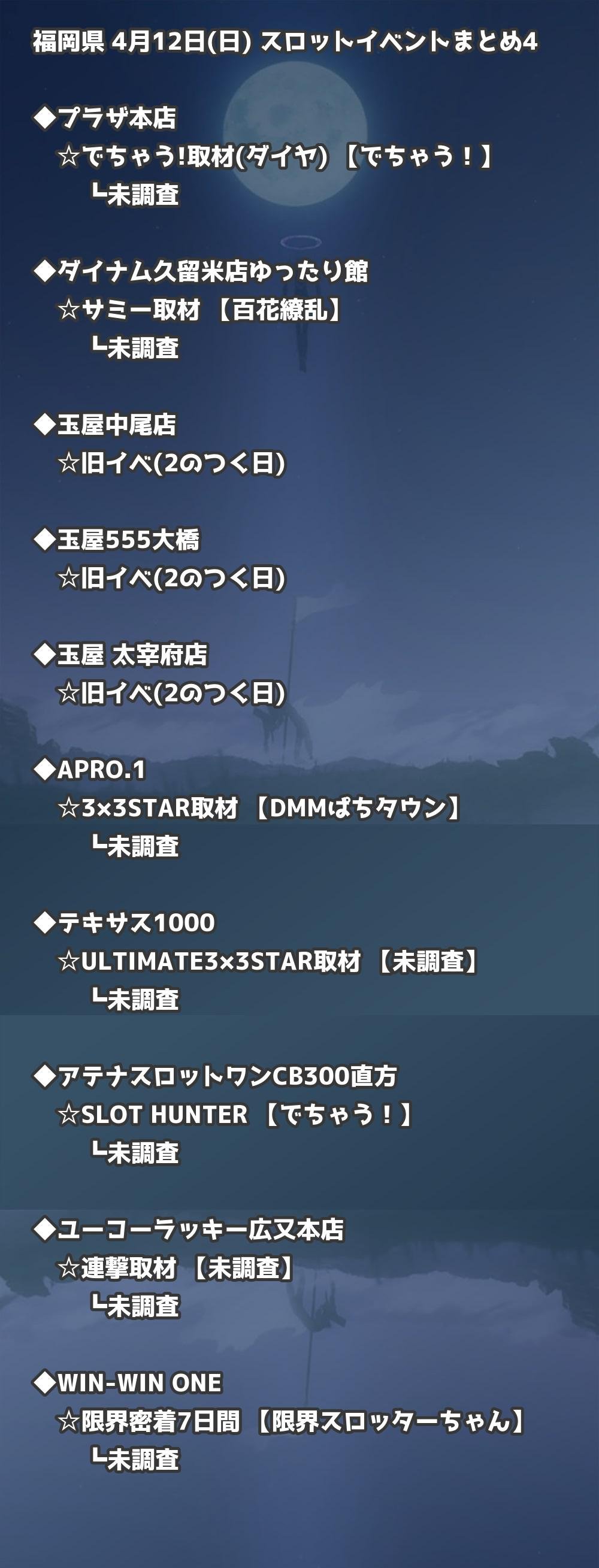 4月12日(日) 福岡県のTOP20の結果を掲載しています。タップで上位機種など詳細が見れます。