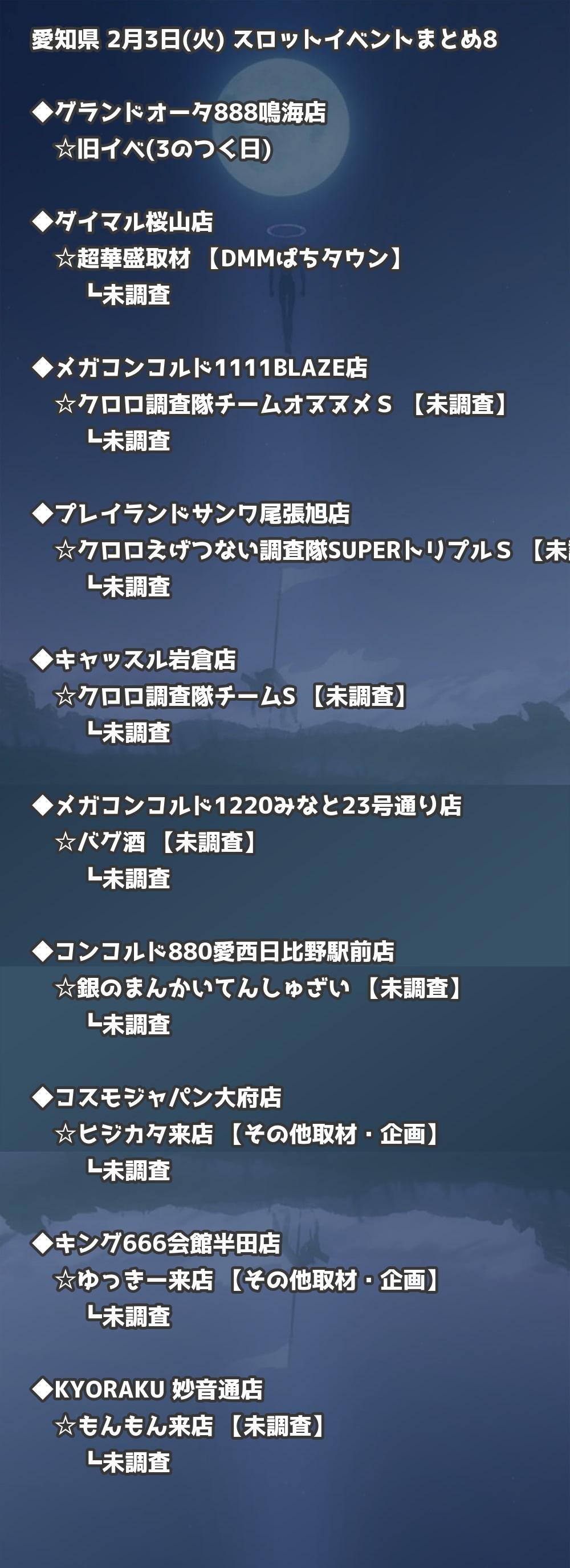 | プレイランドサンワ尾張旭店 | クロロえげつない調査隊SUPERトリプルS | 未調査 |